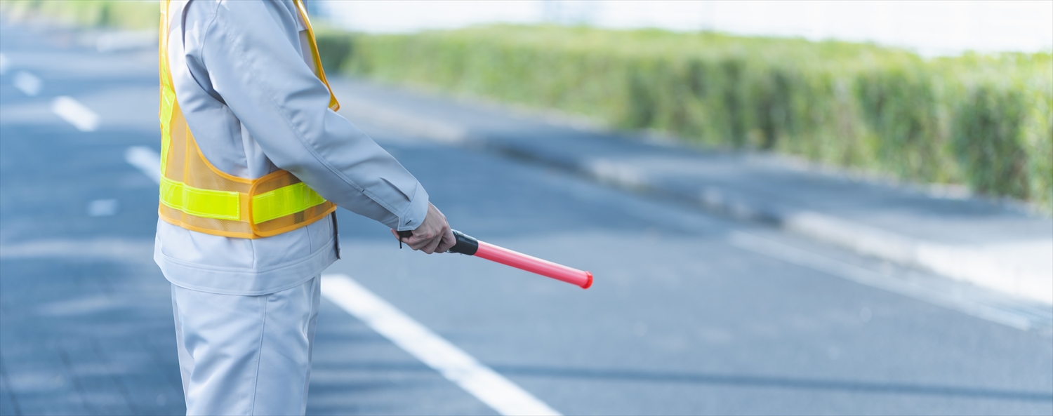 工事現場などに出入りする車両が、周辺の第三者に迷惑を及ぼすことがないよう、出入りを誘導したり、工事現場周辺を通行する車両や歩行者の安全を確保する仕事です。